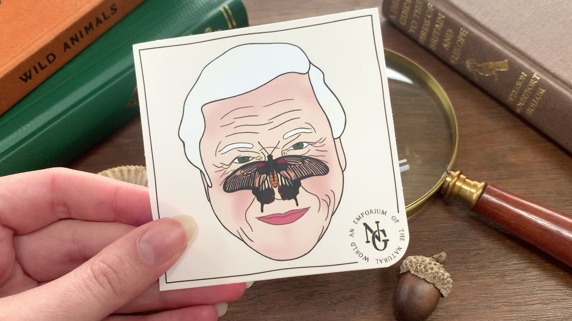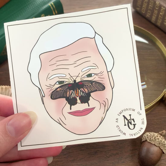 Let everyone know you love our National treasure, David Attenborough, with this cute portrait sticker of the man himself with a butterfly on his nose. Makes a perfect small gift for nature documentary lovers and conservationists.
