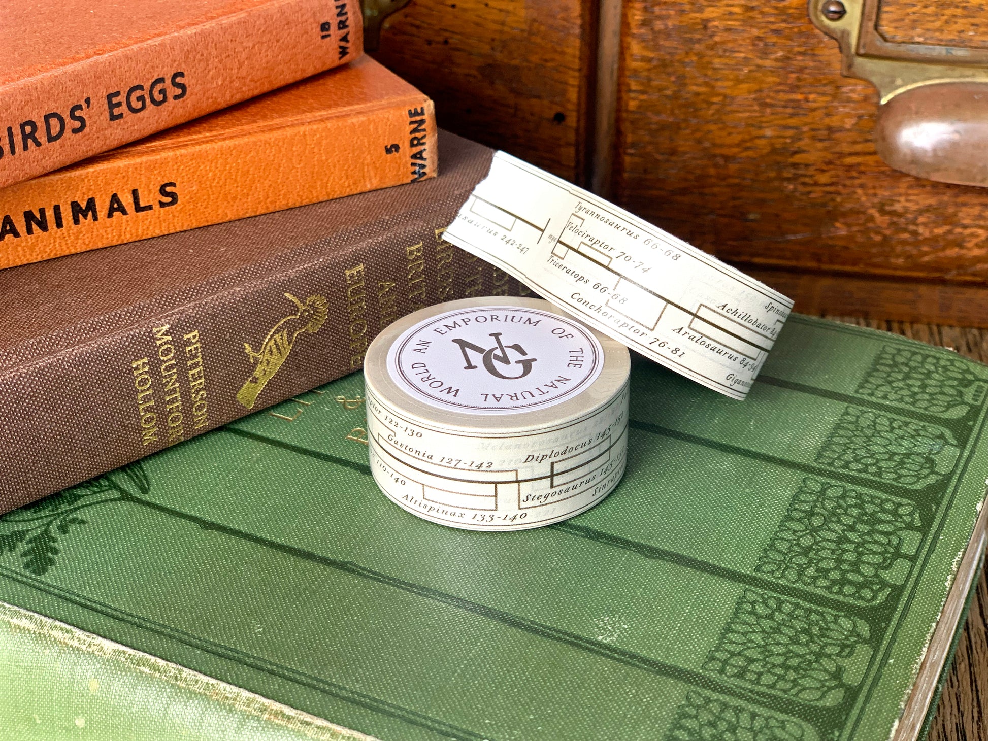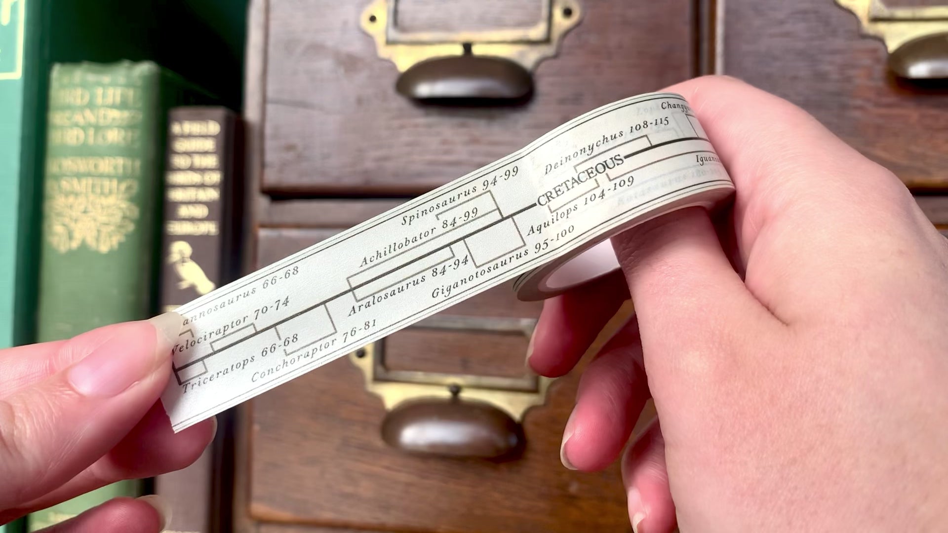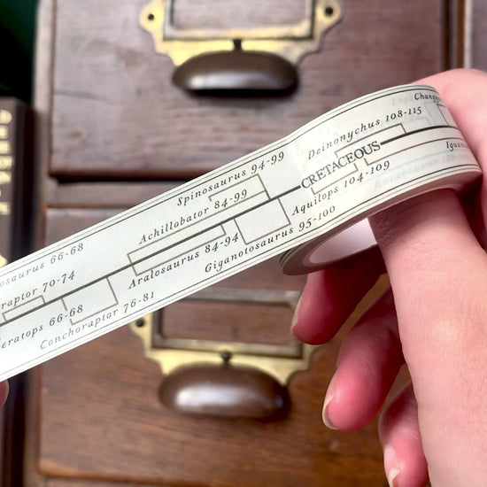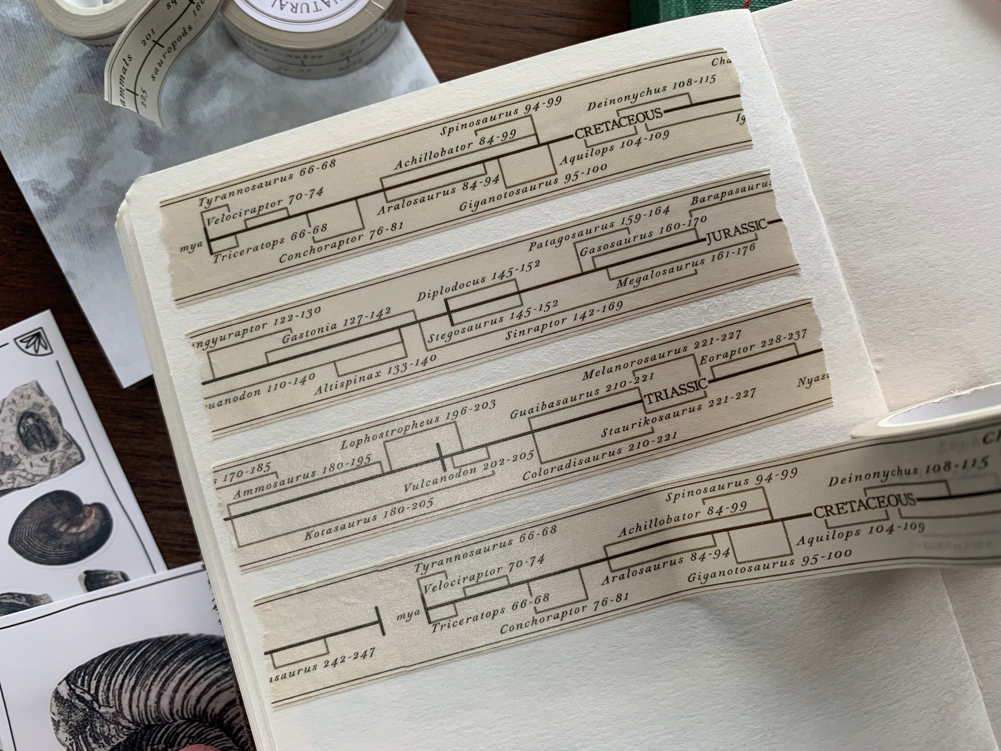 Dinosaur lifespan palaeontology washi tape showing the first and last evidence of popular and notable dinosaur species in a scale of millions of years.