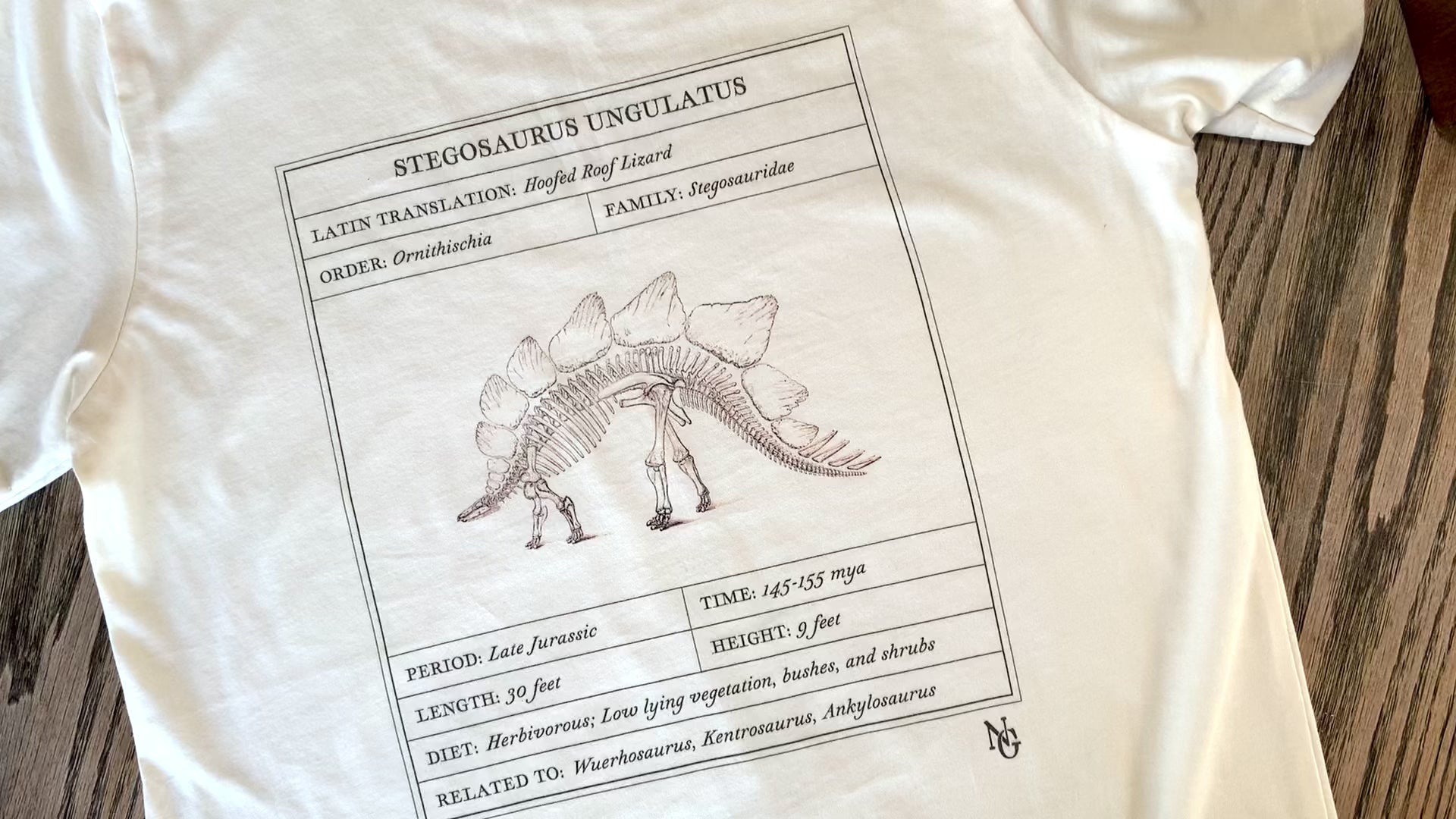 The front features a small, detailed dinosaur sketch, the dinosaur’s name, and its lifespan on the front pocket area designed to be subtle enough for everyday wear. On the back, you’ll find a table with a more detailed illustration and paleontological facts: the Latin name and translation, family and order, period, lifetime, length and height, diet, and related species.