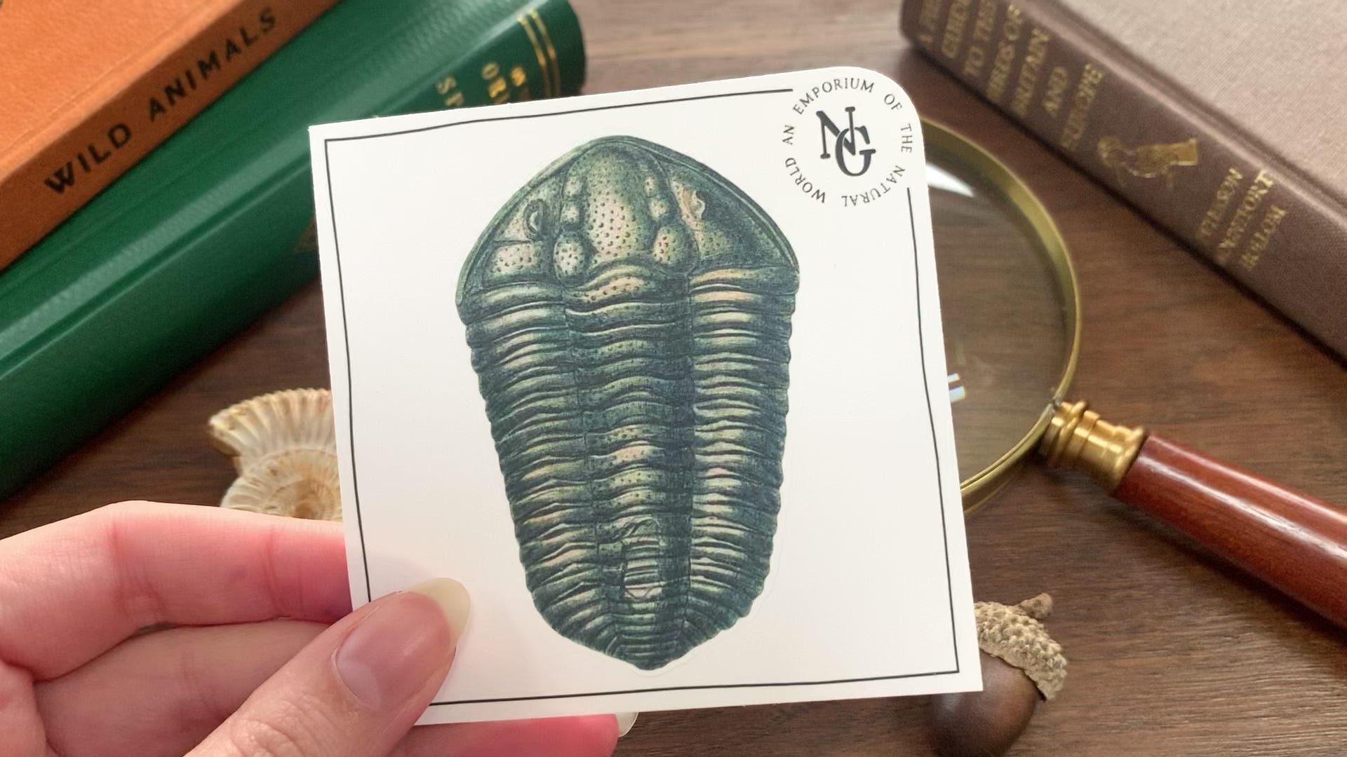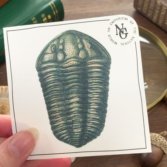 High quality matte vinyl sticker of a trilobite fossil measuring 5cm by 7.4cm, (2” by 3”) on a peelable backing sheet measuring 8.4cm squared.